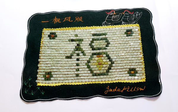 Jade pillow hand made in China, traditional pattern used for happiness, good health, transitions. Each one slightly different.